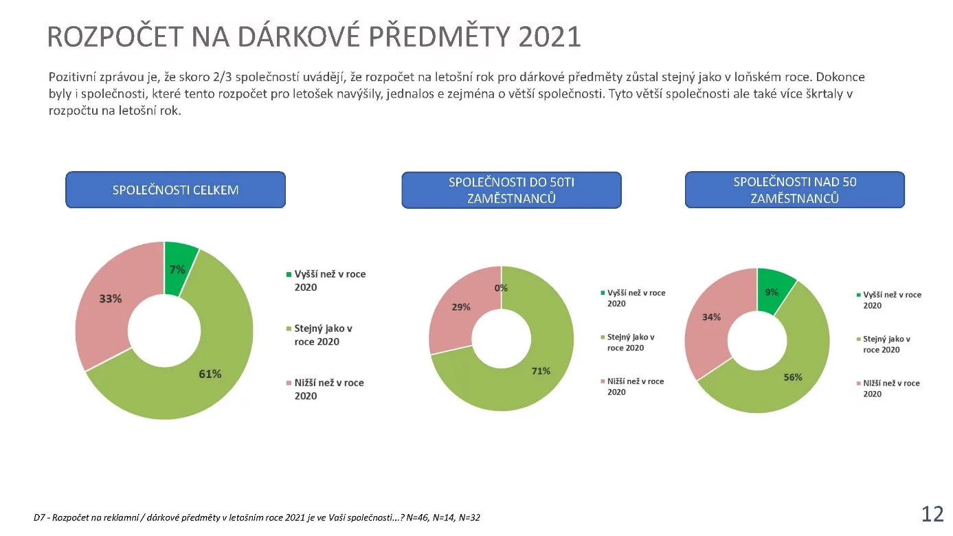 61 % dotazovaných firem potvrdilo, že jejich rozpočet pro oblast dárkových předmětů zůstane stejný jako v roce 2020 a dokonce pro 7 % firem bude tento rozpočet vyšší než v předchozím roce. Rozpočet navyšují především společnosti, které mají 50 zaměstnanců a více.