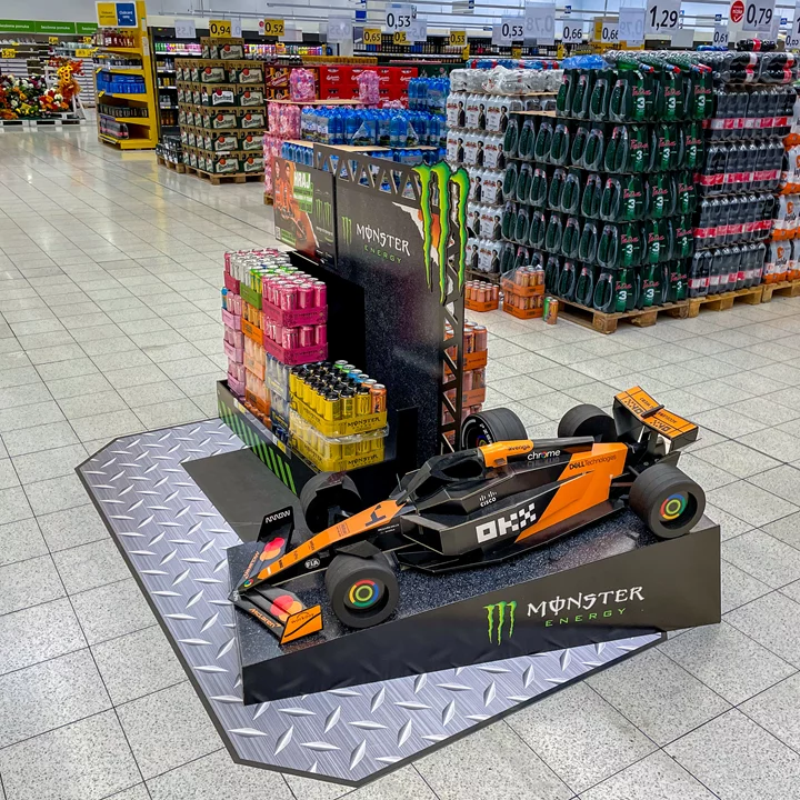 Jedním z technicky nejnáročnějších prvků celé instalace byla bezesporu výroba samotného modelu formule. Převod 3D vizualizace do výsledného výrobního výkresu byla samozřejmě práce pro firemní oddělení konstrukce. Pro něj byla z hlediska konstrukční náročnosti největší výzvou práce s oblými plochami – tak, aby se co nejvíce zachoval vizuální charakter modelu a zároveň byl tvar realizovatelný v reálné výrobě. Sestavení vzorového modelu trvalo přibližně 3,5 hodiny, pro sériovou výrobu byla samozřejmě doba optimalizována. Formule je vyrobena z kombinace různých materiálů – základ tvoří vlnitá lepenka, osy kol jsou z PVC trubek, dekorativní detaily jako zrcátka a závěsy kol z PSH plastu tloušťky. Některé prvky (např. drobné detaily) vznikly pomocí 3D tisku, kola byla tvořena z extrudovaného polystyrenu.